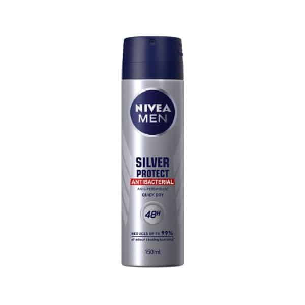 اسپری ضدتعریق مردانه NIVEA MEN Silver Protect ، یکی از قدرتمندترین محصولات برند نیوا برای مقابله با تعریق و بوی نامطبوع بدن است. این اسپری با بهره‌گیری از یون‌های نقره به‌عنوان ماده فعال، خاصیت آنتی‌باکتریال داشته و از رشد باکتری‌های ایجادکننده بوی بد جلوگیری می‌کند. محافظت ۴۸ ساعته در برابر تعریق و رایحه‌ای خنک و مردانه، باعث می‌شود این محصول انتخابی ایده‌آل برای آقایان پرتحرک و فعال باشد.